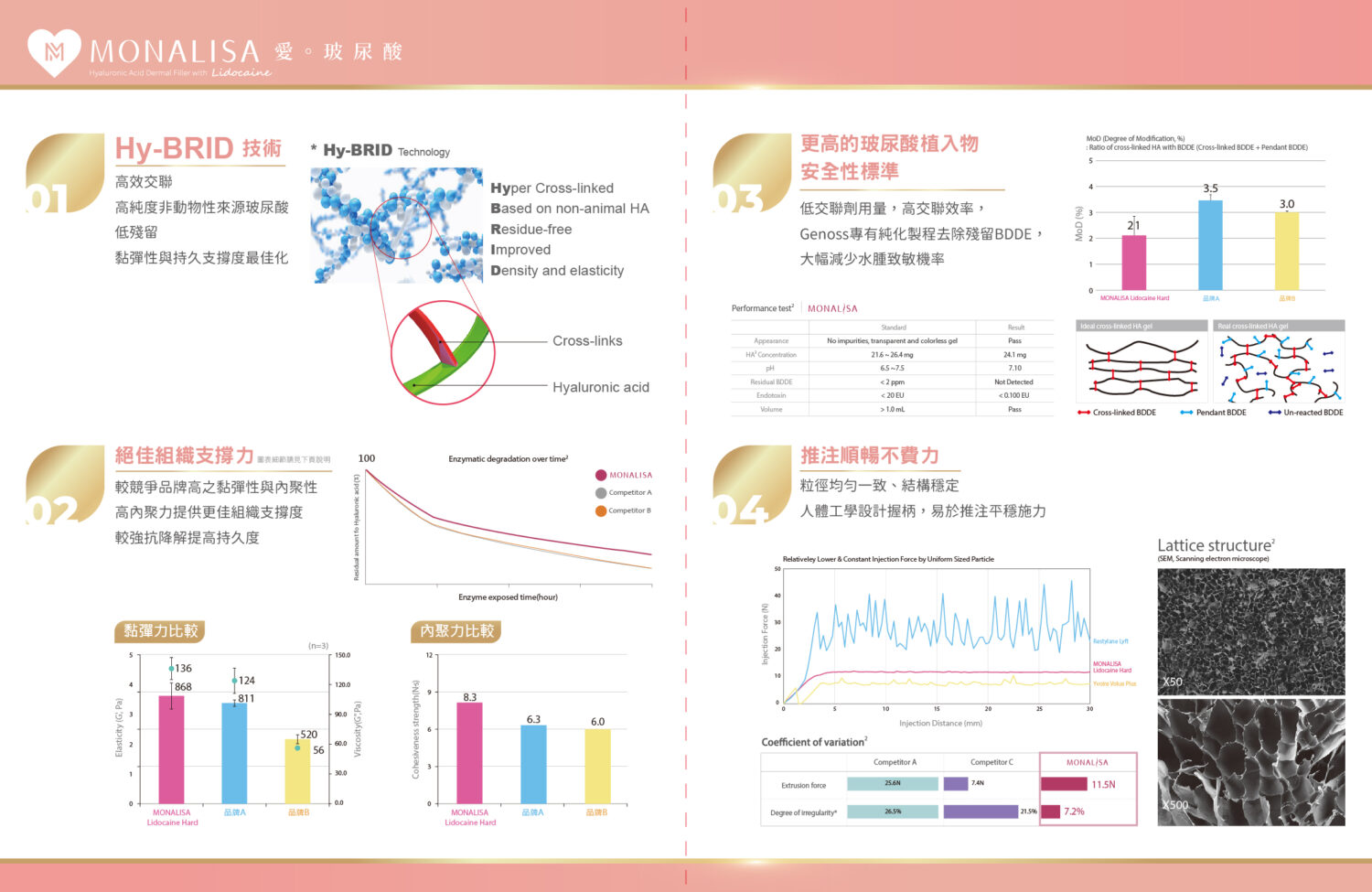 蒙娜麗莎玻尿酸作者: user / 20 1 月, 2025 Monalisa蒙娜麗莎玻尿酸(愛‧玻尿酸)Monalisa蒙娜麗莎玻尿酸是由韓國 Genoss 生技大廠研發之玻尿酸填充劑 於2014年通過KFDA, 陸續通過歐盟、中國等地多國認證核准。採用獨特的 Hy-BRID 交聯技術,使用非動物性玻尿酸, 平衡了黏彈性和豐盈持久度與獨特GCWs純化製程更提高了使用的安全性並且降低敏感及水腫的機率。 Monalisa蒙娜麗莎玻尿酸優勢顆粒型雙相玻尿酸粒徑均勻之中大分子黏彈性與持久度最佳化採用非動物性高純度玻尿酸GCWs純化系統BDDE殘留無檢出提升立體輪廓展現360 ° 無死角的魅力豐盈蘋果肌 修飾下巴線條: 填補凹陷部位 淡化疲憊紋路精緻五官,立體有型,青春凍結,自帶濾鏡還原超自然真實的美!