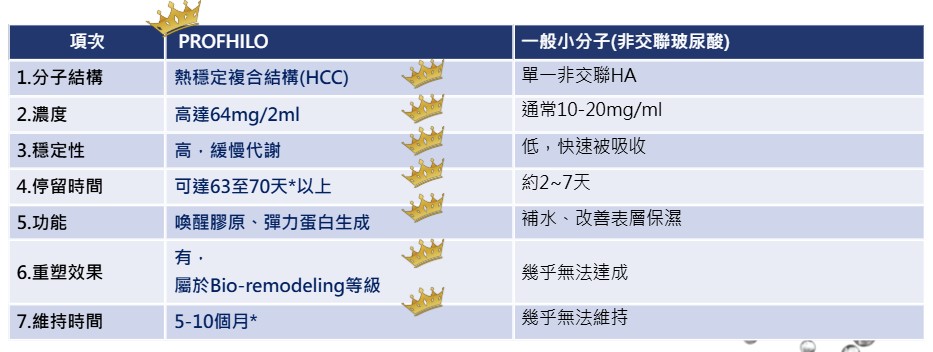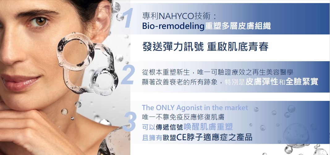 - 專利成分: 採用瑞士IBSA藥廠的專利NAHYCO™技術,將高分子與低分子玻尿酸穩定結合,形成高濃度、高純度的複合成分 (Hybrid Cooperative Complexes)。