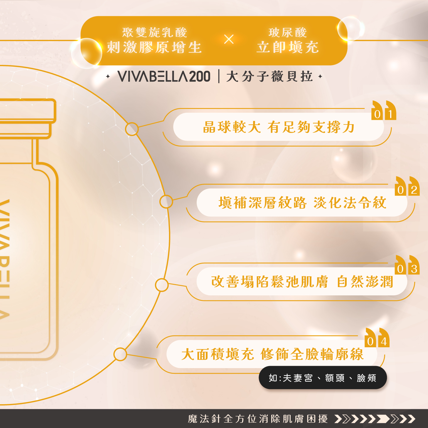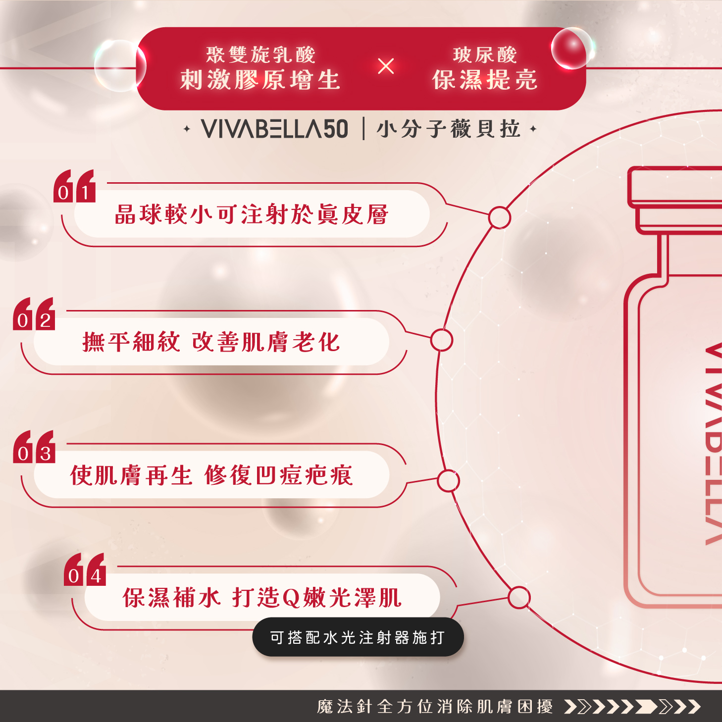 薇貝拉魔法針是新一代膠原蛋白增生劑:通過歐盟CE、韓國KFDA的認證,更是第一個在台灣TFDA取得認證的「多效型膠原蛋白增生劑」結合聚雙旋乳酸PDLLA長期刺激膠原蛋白增生的特性及玻尿酸HA帶來的立即填充的效果,施作後不易產生結節、不須按摩、舒適度高。完美結合-聚雙旋乳酸PDLLA & 玻尿酸立即填充+持續刺激膠原蛋白增生一瓶同時改善老化問題!